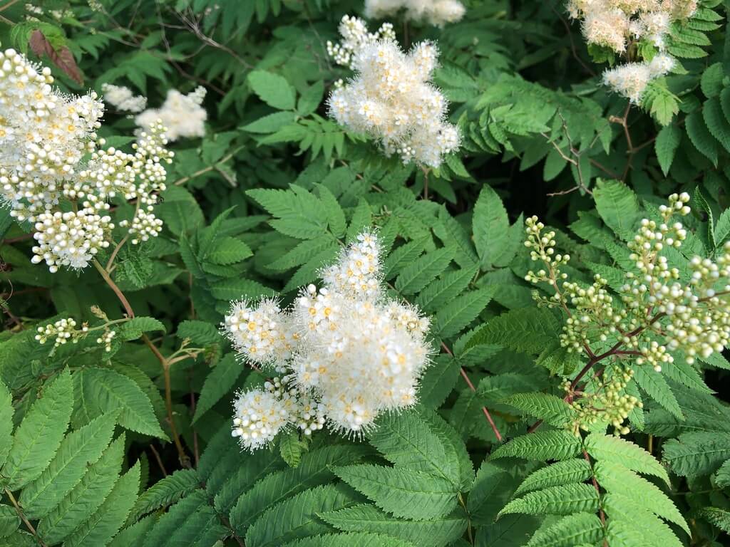 It might be mistaken for our native goat's beard, Aruncus dioicus. Goatsbeard has much smaller flowers, with flower clusters appearing more like small white fingers drooping from the ends of the branches. It may also be mistaken for mountain ash (Sorbus species), but False Spiraea does not produce red or orange berries in the fall, and is a multi-stemmed bush. Mountain ashes typically have one main trunk and grow to much greater heights.
