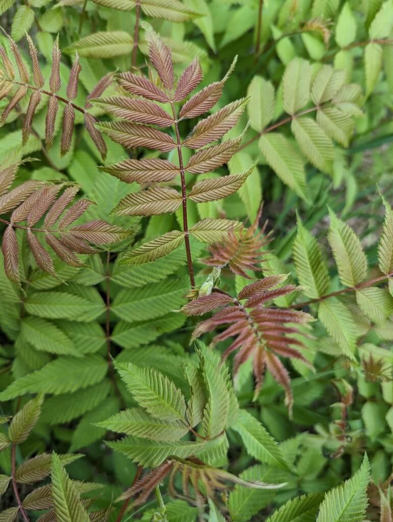False spiraea has been planted as a garden plant in Kodiak and is known to make extremely dense clumps. It is very difficult to remove once established. It is a woody shrub with compound, alternate leaves and a spray of white flowers that emerge at the end of branches.